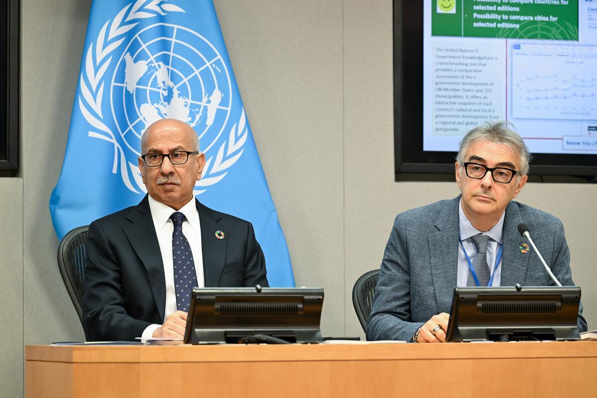 Navid Hanif (left), Assistant Secretary-General for Economic Development of UN Department of Economic and Social Affairs (DESA), and Vincenzo Aquaro, Chief of Digital Government Branch of UN DESA, brief reporters on the 2024 edition of United Nations E-Government Survey: Accelerating Digital Transformation for Sustainable Development.