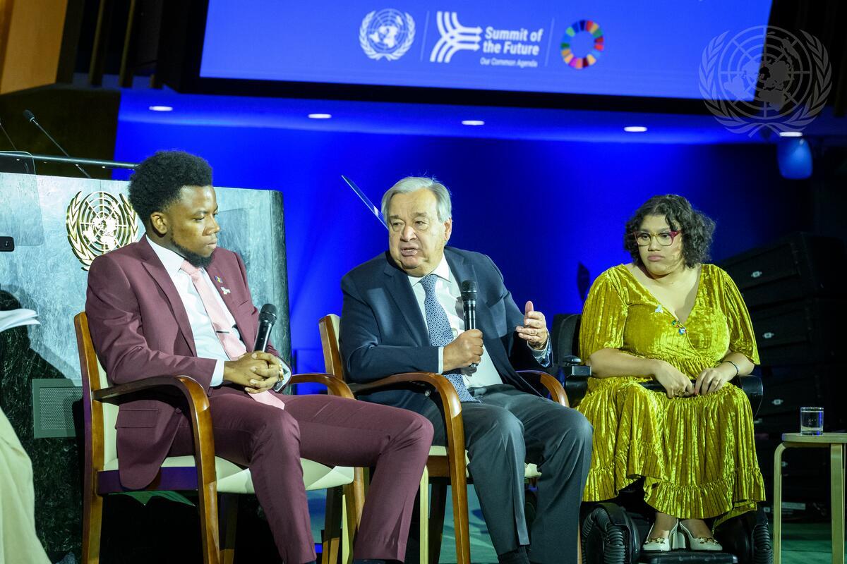 A dialogue with Secretary-General António Guterres (centre) is held during the opening of Summit of the Future Action Days. The theme of Day One is "#YouthLead for the Future: We believe in the promise of a better world for all ". At left is Caleb Brathwaite, Presidnet of the Barbados Youth Development Council, and at right is Daphne Frias, Youth Activist, Organizer and Storyteller.
