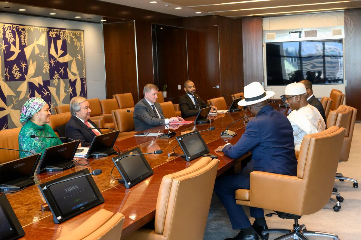 Secretary-General António Guterres (second from left) meets with Philemon Yang (second from right), President of the seventy-ninth session of the United Nations General Assembly. At left is Deputy Secretary-General Amina Mohammed.