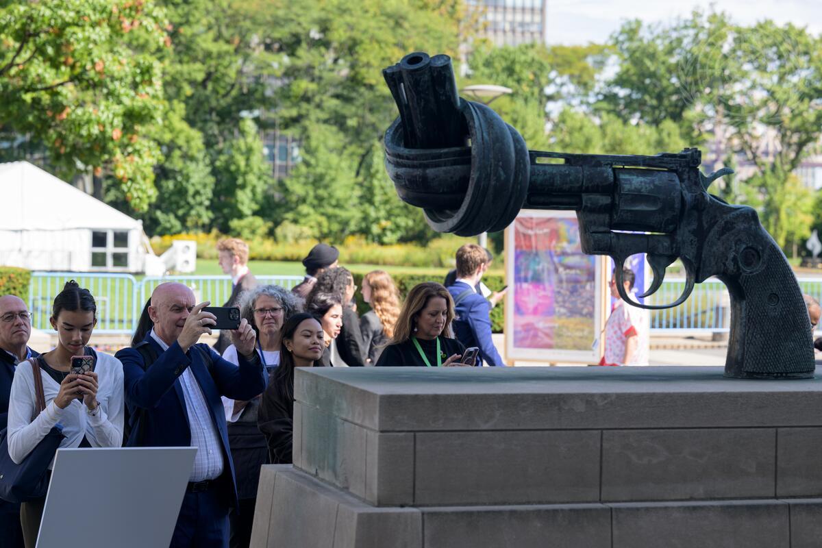 Participants take photos on the Visitors Plaza at UN Headquarters during the first Summit of the Future Action Day.
