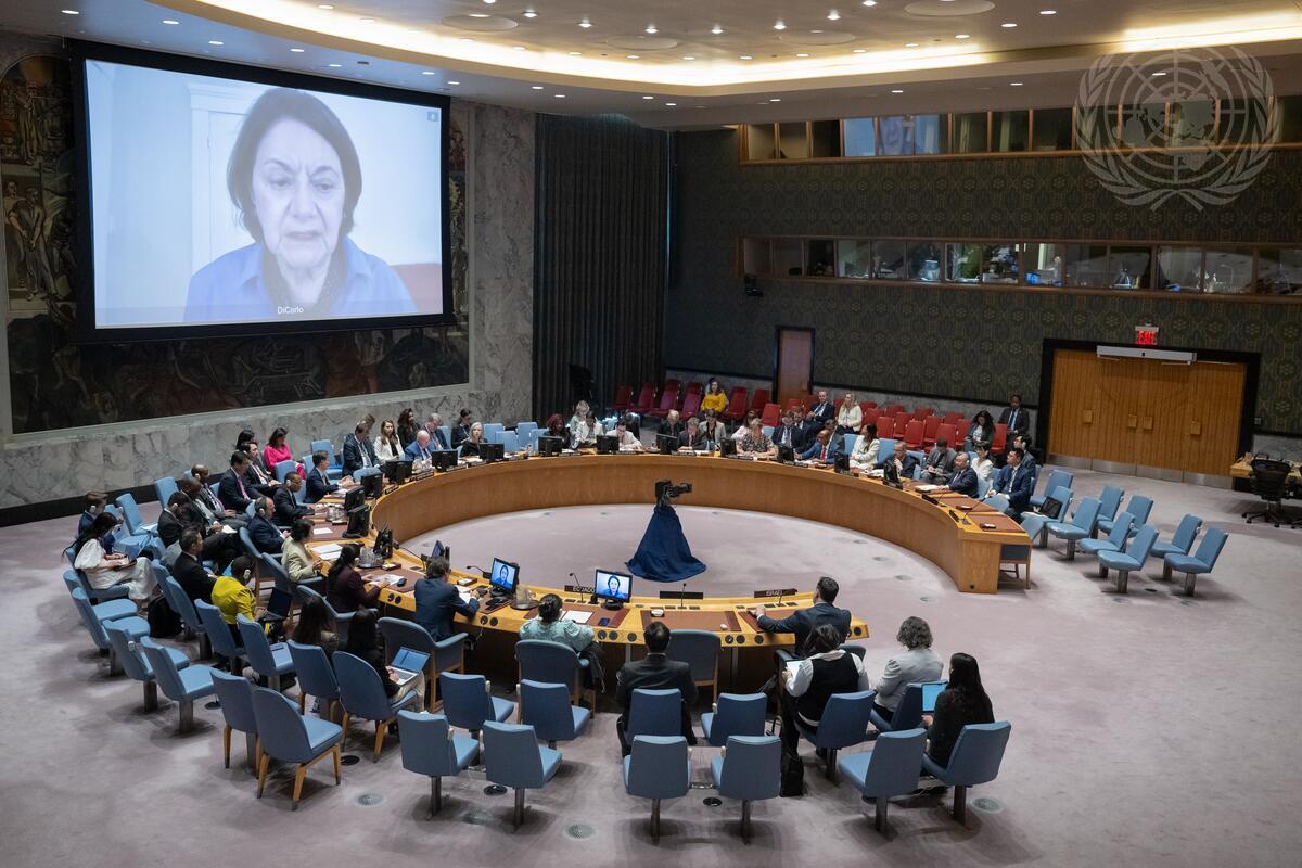 A wide view of the Security Council meeting on threats to international peace and security. On the screen is Rosemary DiCarlo, Under-Secretary-General for Political and Peacebuilding Affairs.
