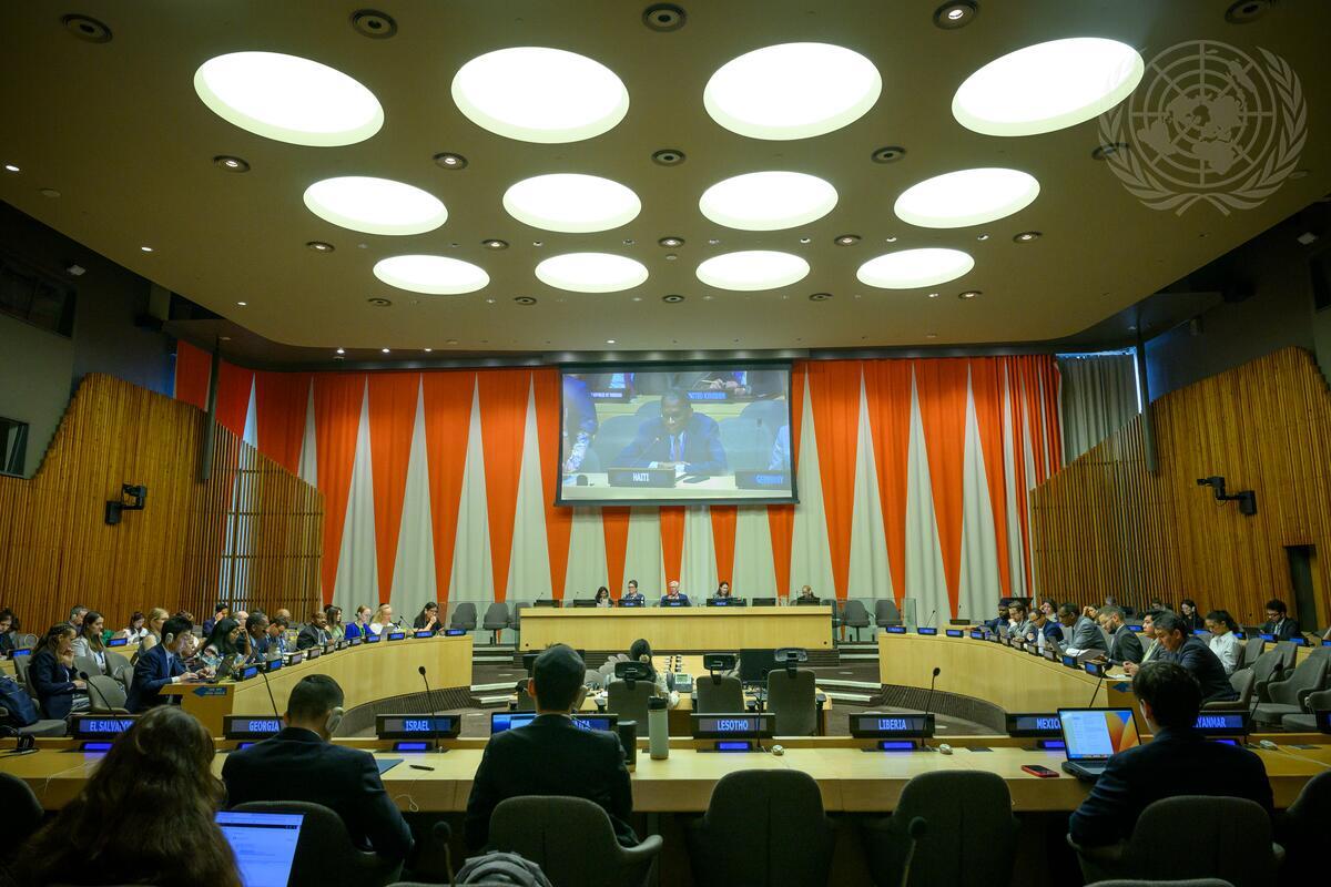 A wide view of the 38th plenary meeting of the Economic and Social Council 2024 Management Segment (23–24 July 2024). On the screen is Antonio Rodrigue, Permanent Representative of Haiti to the United Nations.