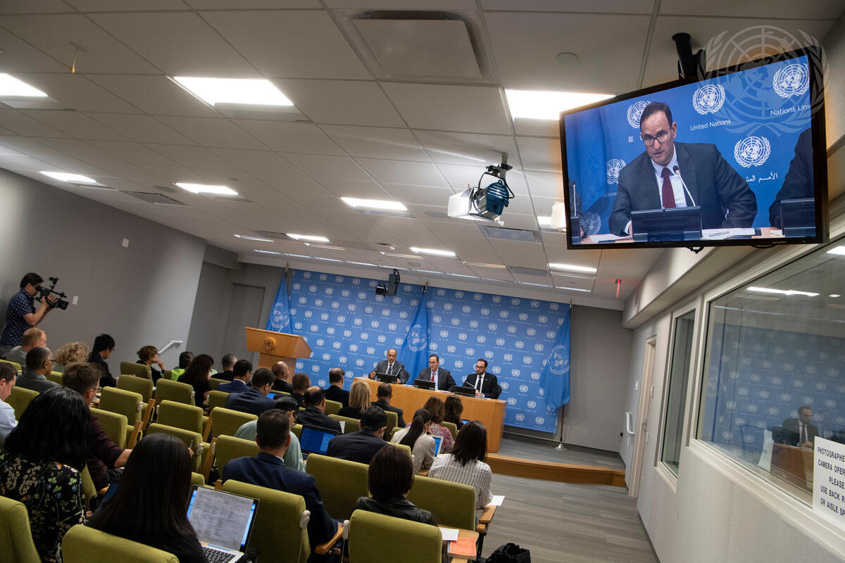 Mansour Al-Otaibi (on screen and centre at dais), Permanent Representative of Kuwait to the United Nations and President of the Security Council for the month of June, briefs press on the programme of work for the Security Council.