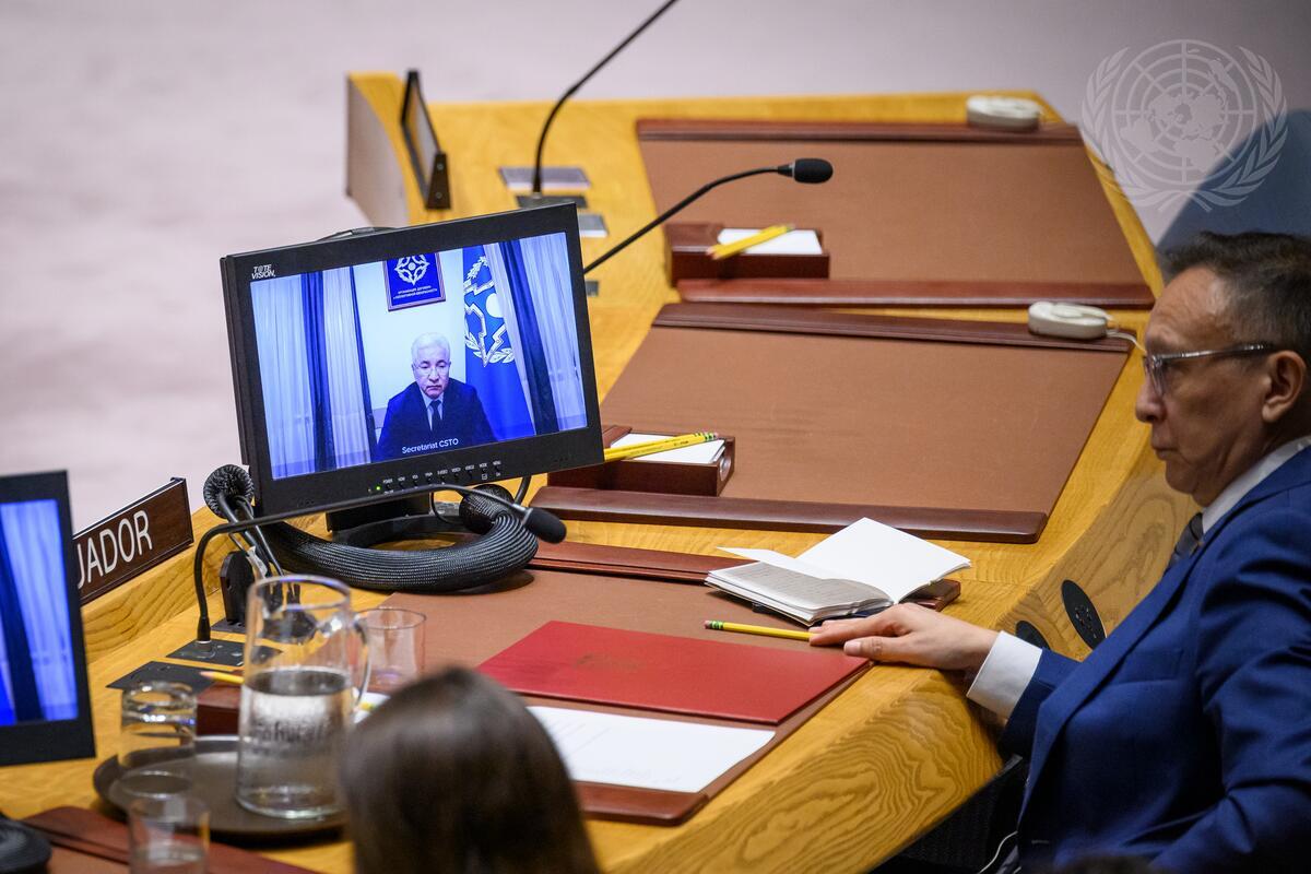 Imangali Tasmagambetov (on screen), Secretary-General of the Collective Security Treaty Organization (CSTO), briefs the Security Council meeting on cooperation between the United Nations and regional and subregional organizations in maintaining international peace and security. The meeting focused on the Collective Security Treaty Organization (CSTO), the Commonwealth of Independent States (CIS), the Shanghai Cooperation Organization (SCO).
