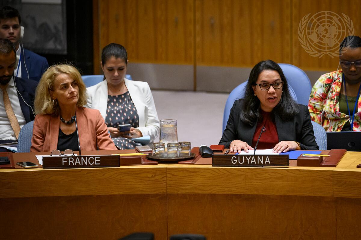Carolyn Rodrigues-Birkett (right), Permanent Representative of Guyana to the United Nations, speaks at the Security Council meeting on the situation concerning Democratic Republic of Congo. On the left is Nathalie Broadhurst Estival, Deputy Permanent Representative of France to the United Nations.