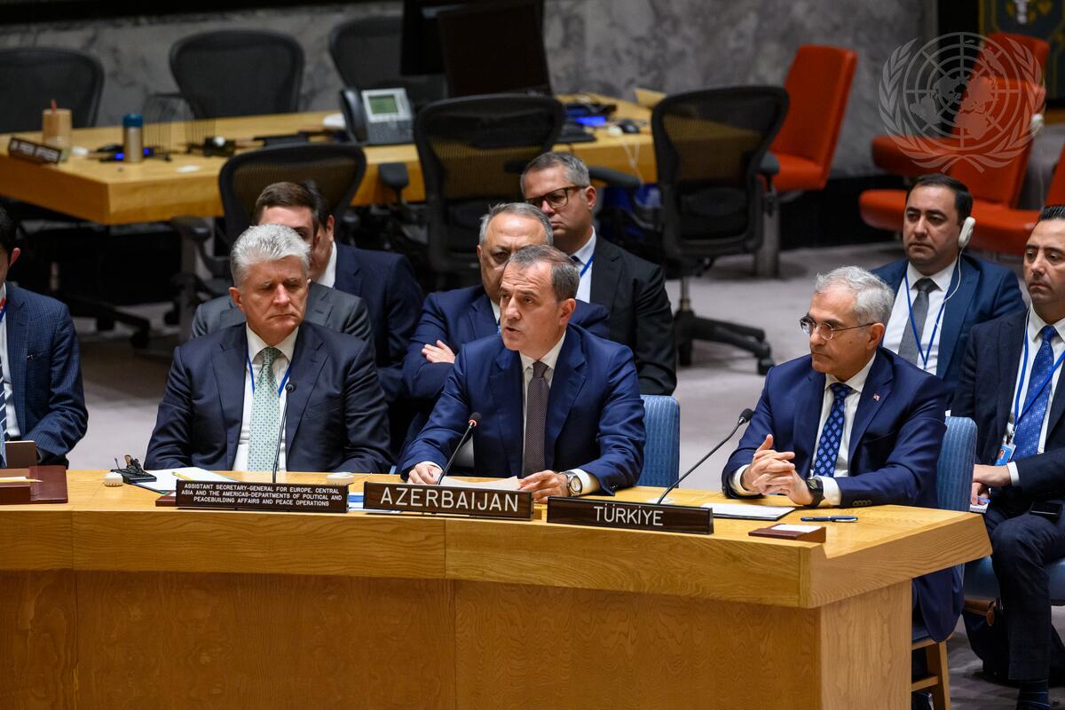 Jeyhun Bayramov (centre), Minister for Foreign Affairs of the Republic of Azerbaijan, addresses the Security Council meeting on the letter dated 13 September 2022 from the Permanent Representative of Armenia to the United Nations addressed to the President of the Security Council.