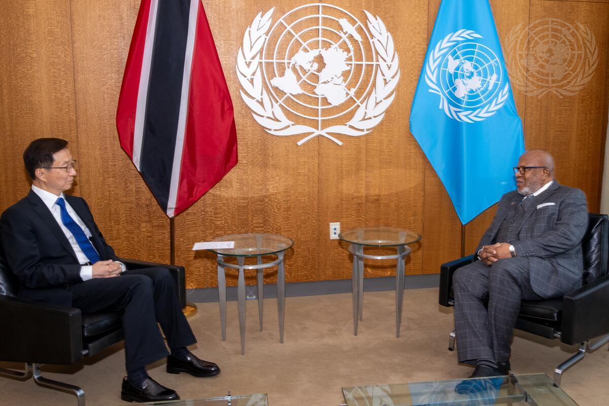 Dennis Francis (right), President of the seventy-eighth session of the General Assembly, meets with Han Zheng, Vice-President of the People’s Republic of China.