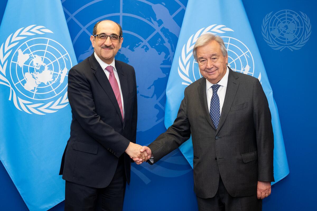 Caption Description Secretary-General António Guterres (right) meets with Bassam Sabbagh, Vice-Minister for Foreign Affairs and Expatriates of the Syrian Arab Republic.