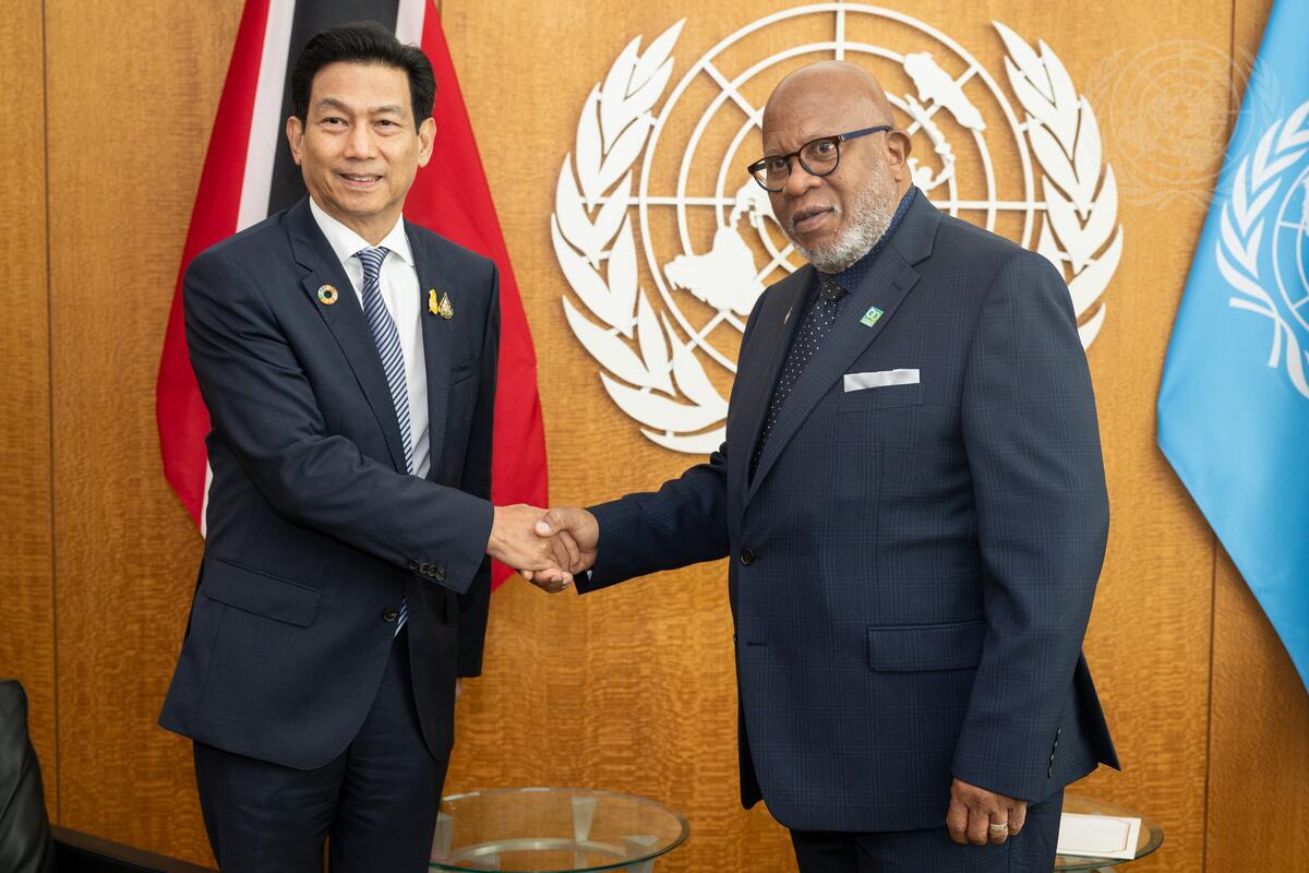 Dennis Francis (right), President of the seventy-eighth session of the General Assembly, meets with Parnpree Bahiddha-Nukara, Deputy Prime Minister and Minister for Foreign Affairs of the Kingdom of Thailand.