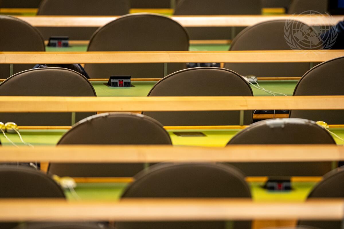 A detailed view of chairs in the General Assembly Hall on the fifth day of 78th General Assembly Debate.