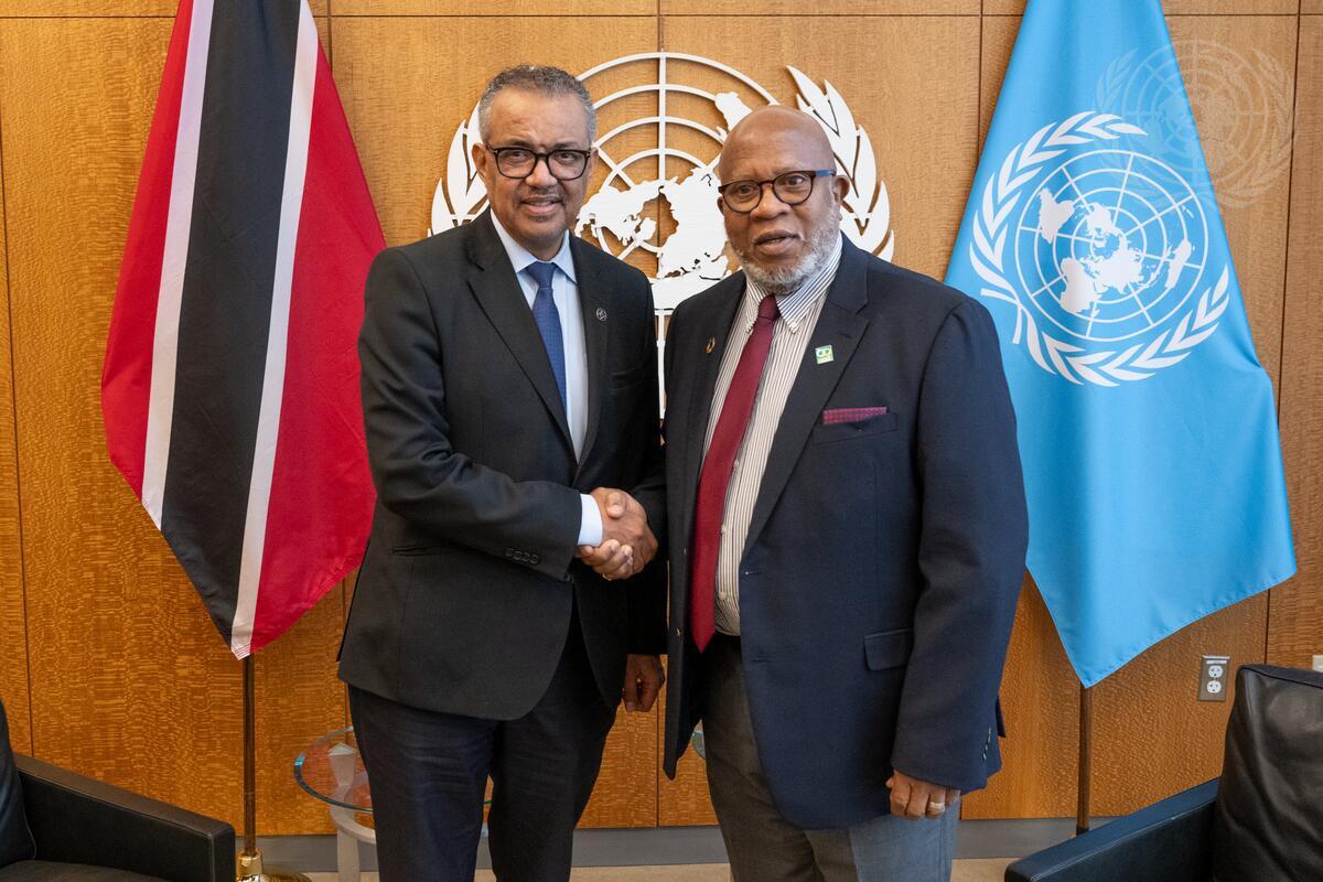 Dennis Francis (right), President of the seventy-eighth session of the General Assembly, meets with Tedros Adhanom Ghebreyesus, Director-General of the World Health Organization (WHO).