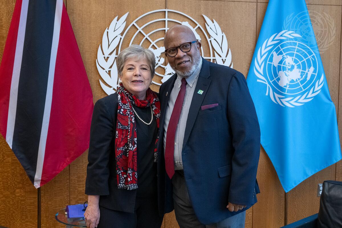 Dennis Francis (right), President of the seventy-eighth session of the General Assembly, meets with Alicia Bárcena Ibarra, Minister for Foreign Affairs of the United States of Mexico.
