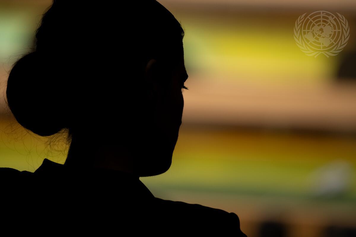 A silhouette of a delegate in the General Assembly Hall on the fourth day of 78th General Assembly Debate.