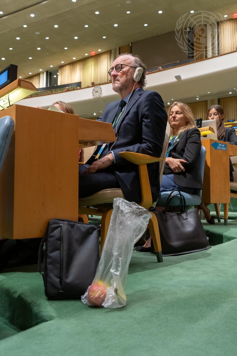 A view of the delegation from Denmark in the General Assembly Hall as Dan Jørgensen (not pictured), Minister for Development Cooperation and Global Climate Policy of Denmark, addresses the general debate of the General Assembly’s seventy-eighth session.