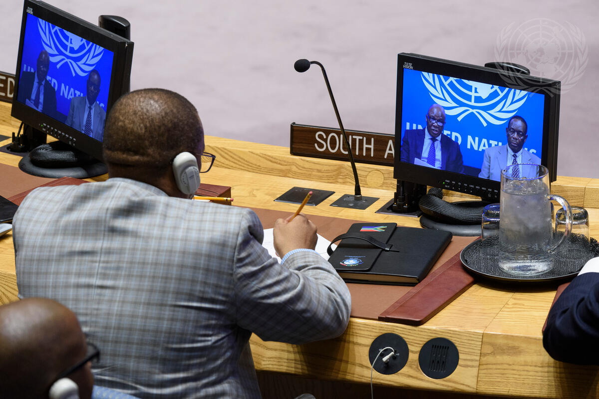 Raisedon Zenenga (on screen right), Deputy Special Representative of the Secretary-General for the United Nations Assistance Mission in Somalia (UNSOM), and Francisco Caetano José Madeira (on screen left), Special Representative of the Chairperson of the African Union Commission for Somalia and Head of the African Union Mission in Somalia, brief the Security Council on the situation in Somalia.