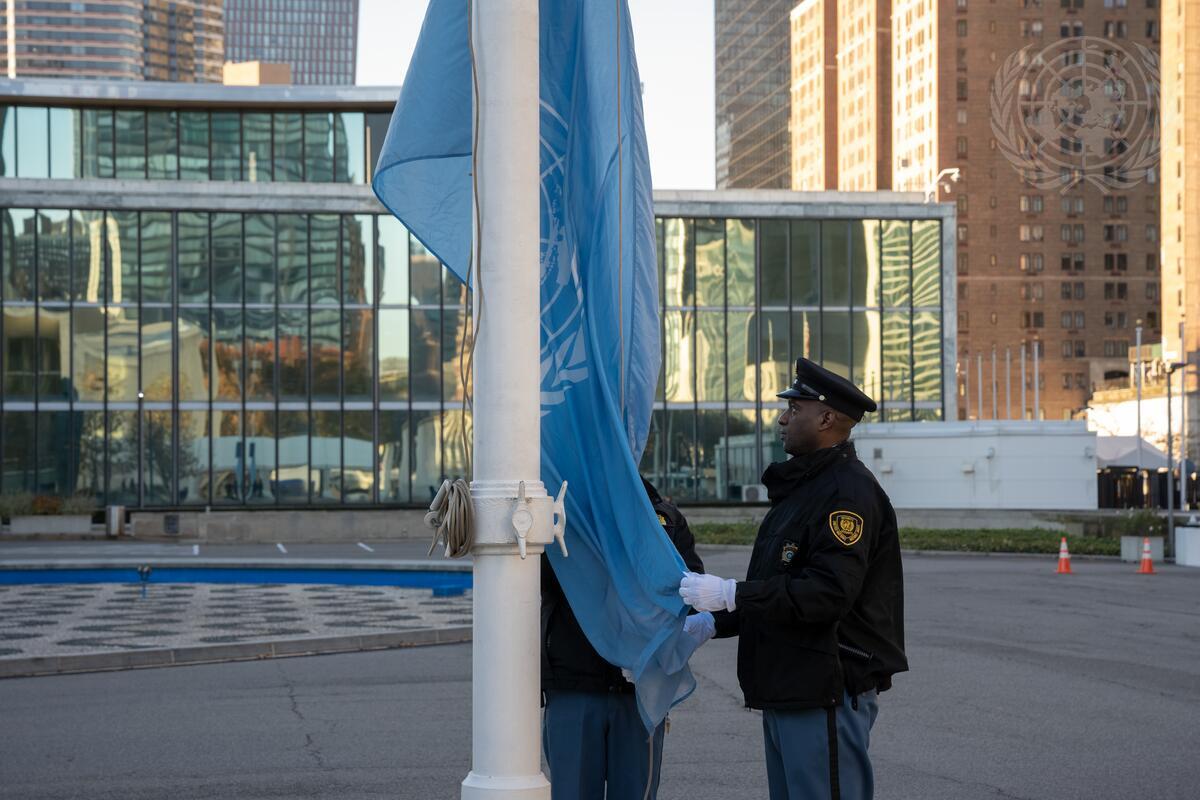 The United Nations flag is lowered to half-mast at UN Headquarters to honour colleagues killed in Gaza.
