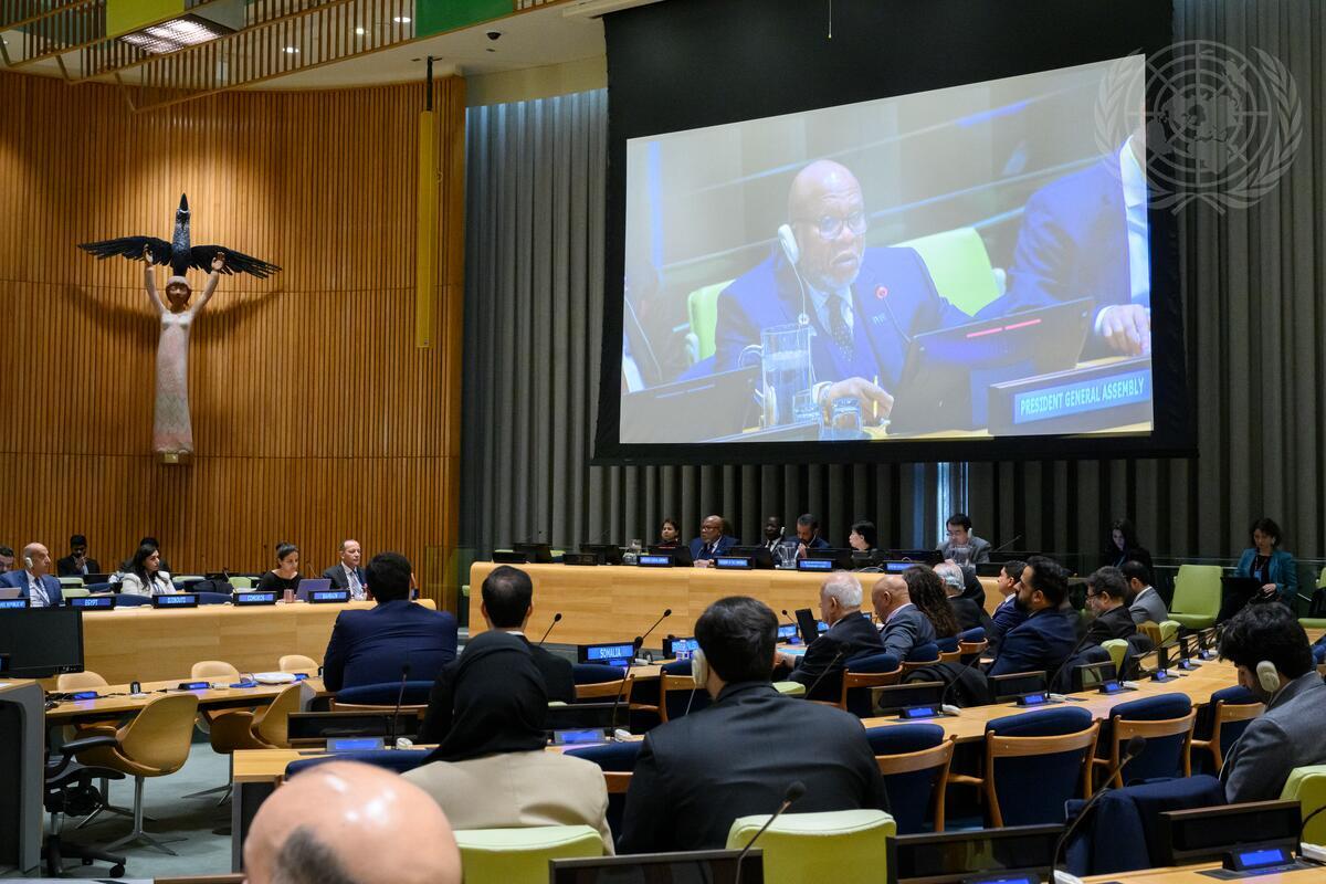 Dennis Francis (on screen), President of the seventy-eighth session of the General Assembly, addresses the fourth session of the Conference on the Establishment of a Middle East Zone Free of nuclear weapons and other Weapons of Mass Destruction.