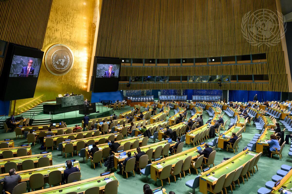 A wide view as Rafael Mariano Grossi (at podium and on screens), Director General of the International Atomic Energy Agency (IAEA), presents the report of the International Atomic Energy Agency to the 29th plenary meeting of the General Assembly.