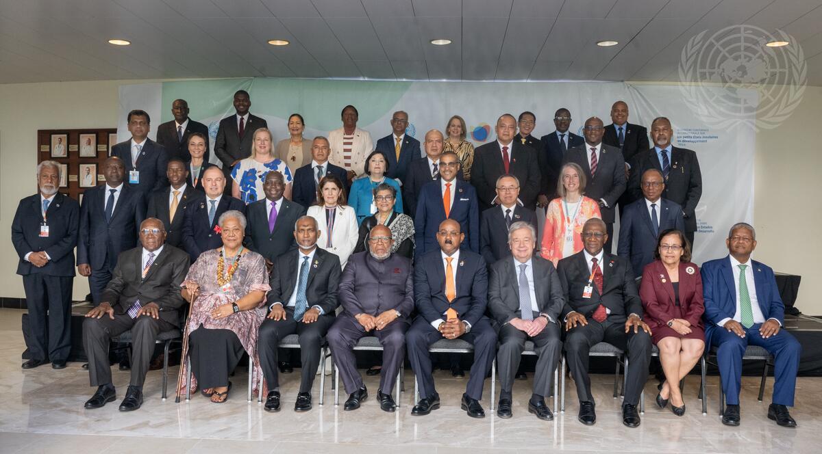 Secretary-General António Guterres (fourth from right) poses for a photo with participants of the fourth International Conference on Small Island Developing States (SIDS4).