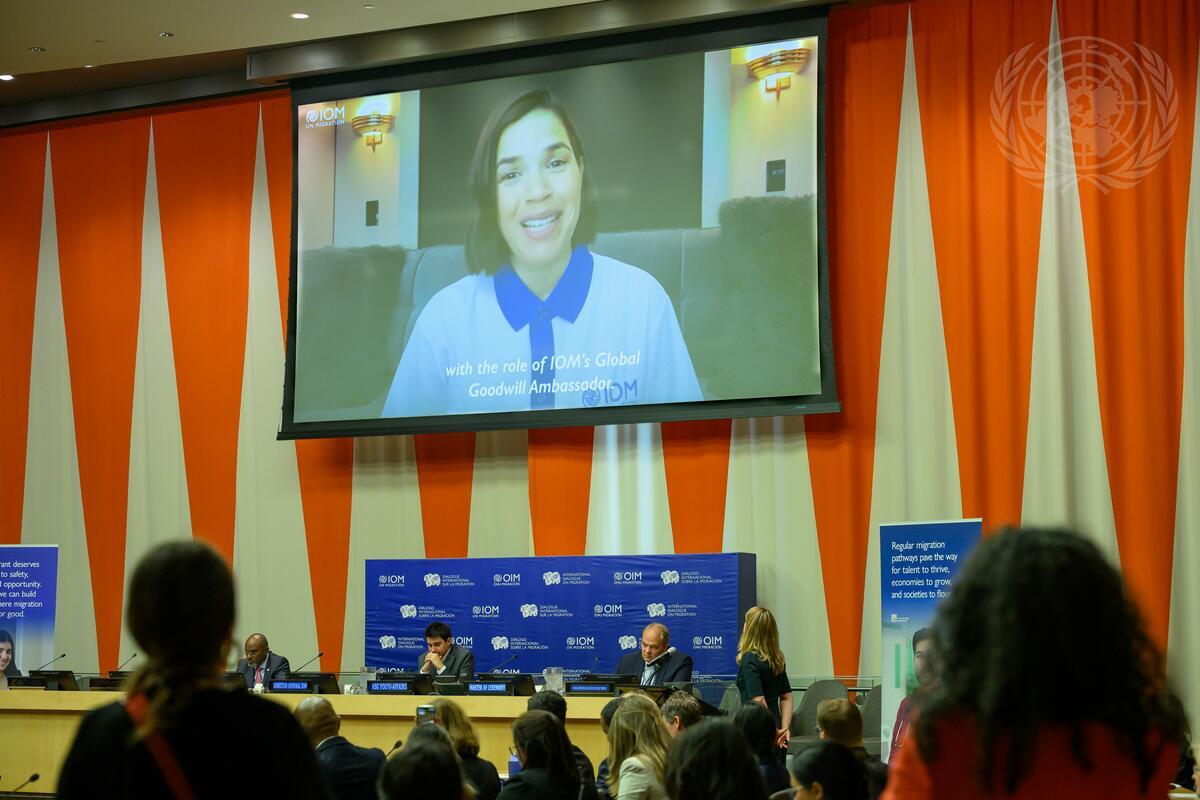 America Ferrera (on screen), Actor, and New Global Goodwill Ambassador for International Organization for Migration (IOM), speaks during the International Dialogue on Migration (IDM) 2024 on the theme “Facilitating Regular Pathways to a Better Future: Harnessing the Power of Migration”.