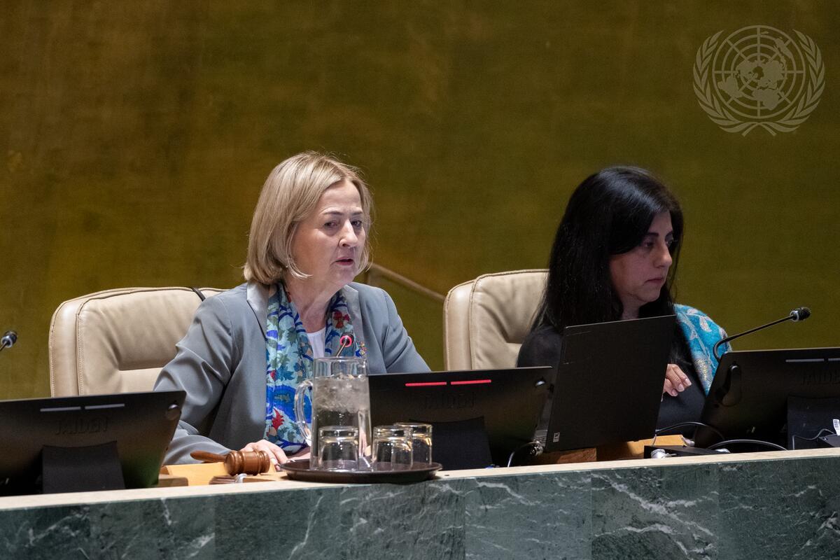 Yoka Brandt (left), Vice-President of the 78th session of the General Assembly and Permanent Representative of the Kingdom of the Netherlands to the United Nations, chairs the 35th General Assembly plenary meeting. The meeting considered the reports of the Fifth Committee on appointments to fill vacancies in subsidiary organs and continued the debate on the question of equitable representation on and increase in the membership of the Security Council and other matters related to the Security Council.
