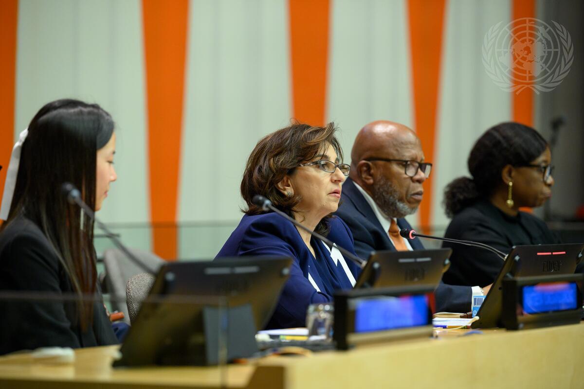 Sima Sami Bahous (centre left), Executive Director of UN Women, speaks during the observance of the International Day for the Elimination of Violence Against Women (25 November). At centre right is Dennis Francis, President of the seventy-eighth session of the General Assembly.