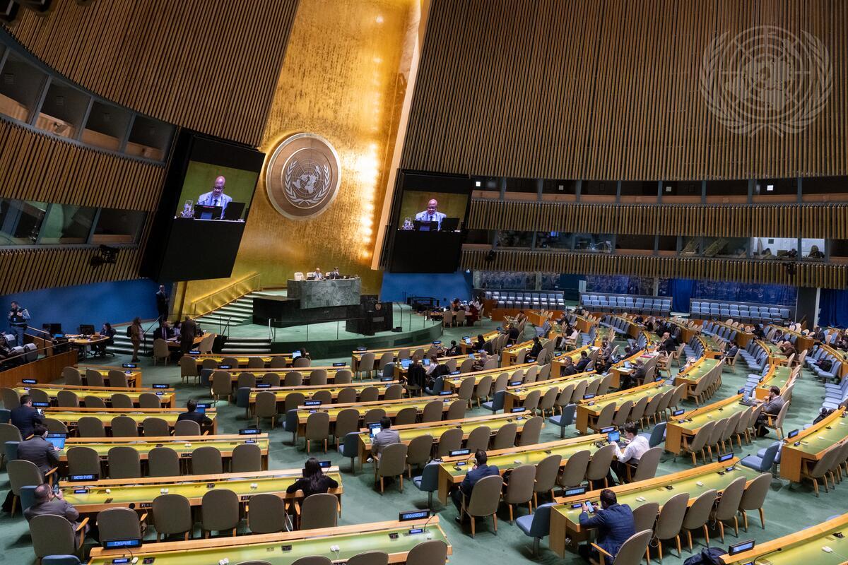 A wide view of the General Assembly Hall as Dennis Francis (on screens), President of the seventy-eighth session of the General Assembly, chairs the 23rd plenary meeting of the General Assembly that heard a report of the Human Rights Council.