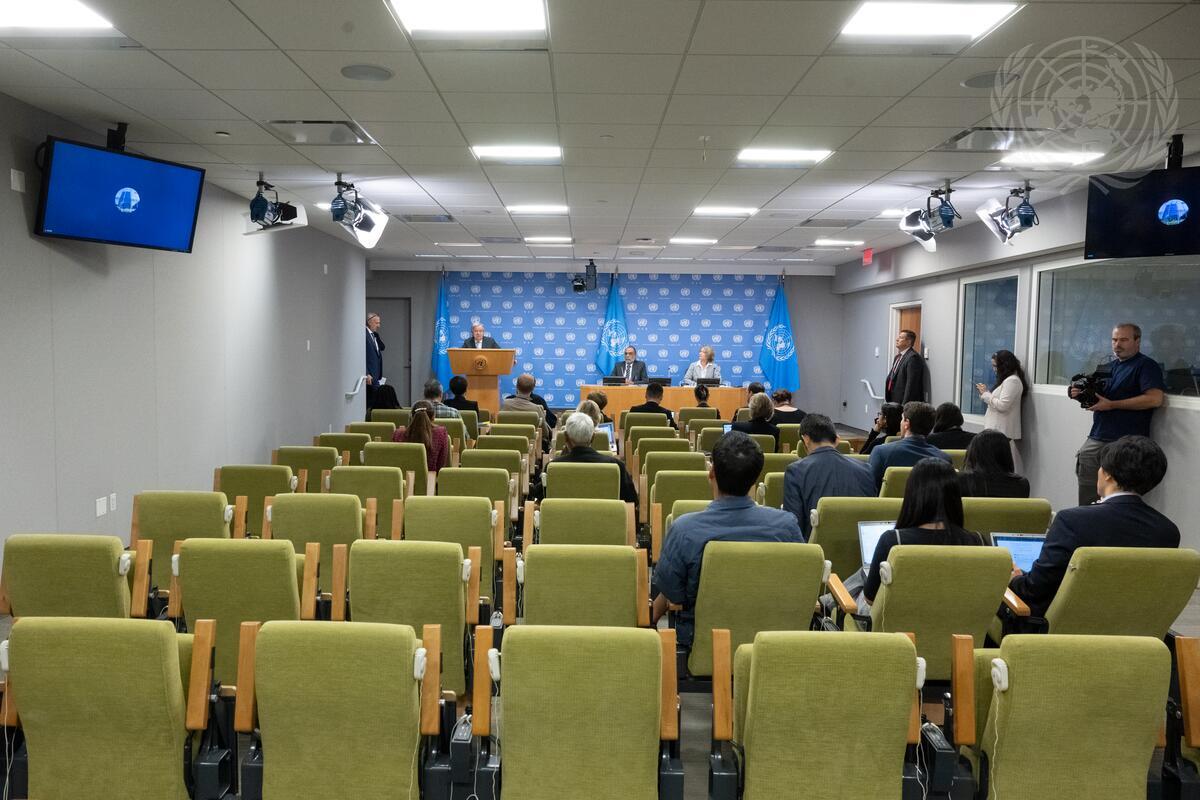 Secretary-General António Guterres (at podium at left) briefs reporters on the launch of his High-Level Advisory Body on Artificial Intelligence (AI).