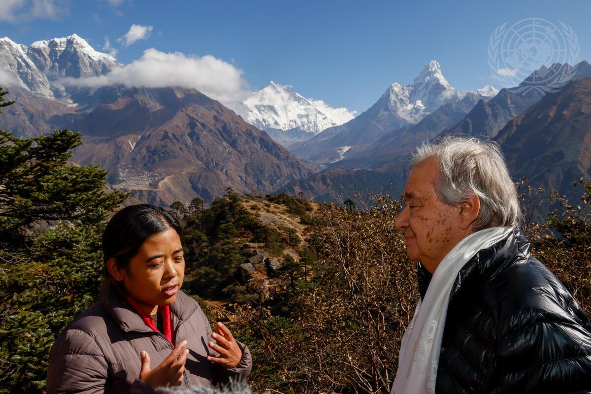 Secretary-General António Guterres (right) meets with local communities in order to hear directly from them about the impact of the climate crisis during his visit to the Everest region in Nepal.