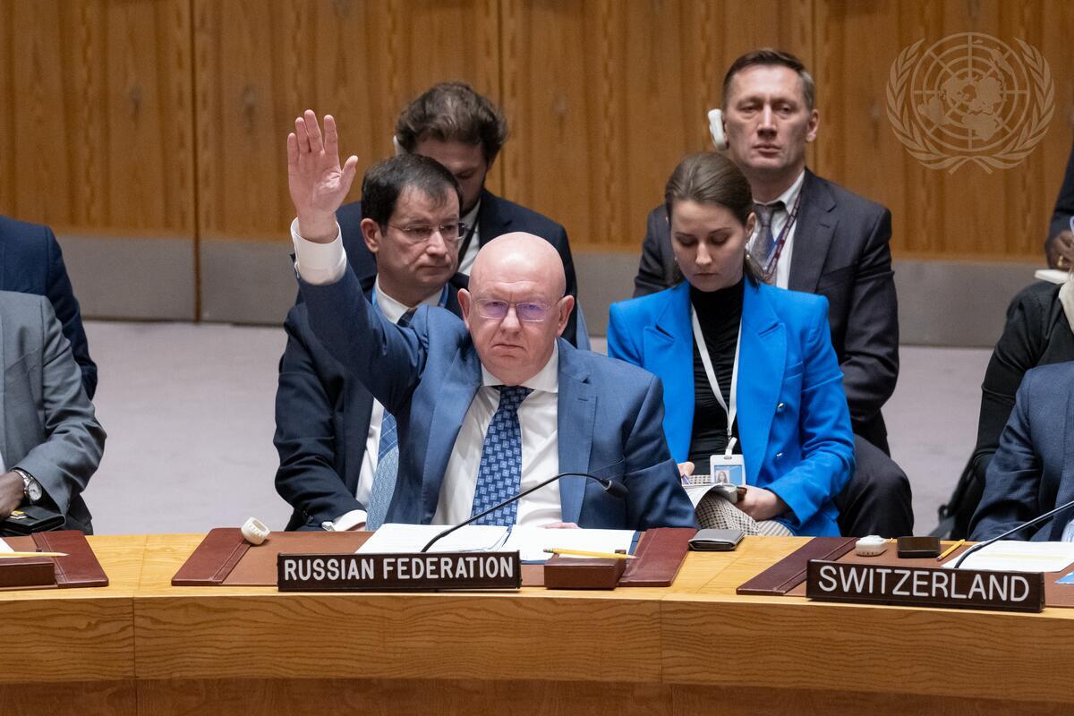 A view of Vassily Nebenzia, Permanent Representative of the Russian Federation to the United Nations, voting against the resolution.