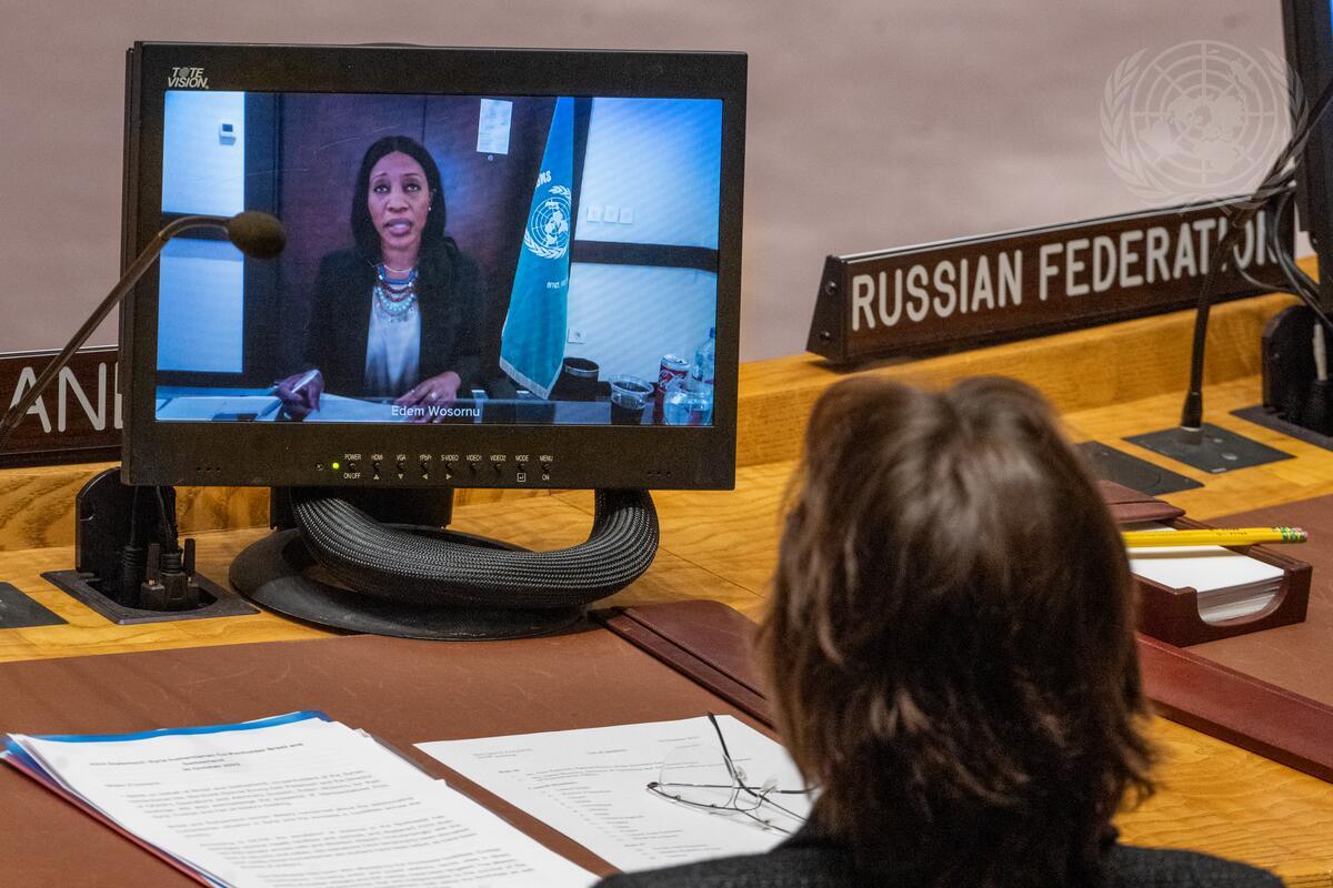 Edem Wosornu (on screen), Director of Operations and Advocacy, Office for the Coordination of Humanitarian Affairs, briefs the Security Council meeting on the situation in the Middle East (Syria).