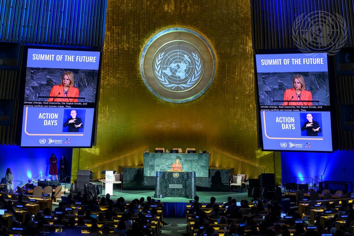 Evelyn Wever-Croes (at podium and on screens), Prime Minister of Aruba, addresses the opening of Summit of the Future Action Day Two. Action Day 2, which coincides with International Day of Peace, focuses on multistakeholder partnership and action – paving a way towards a next chapter of multilateralism that is more inclusive and networked. To achieve this, the Action Day 2 will address three priority themes: A Digital Future for All; A Peaceful Future for All; and A Sustainable Future for All.