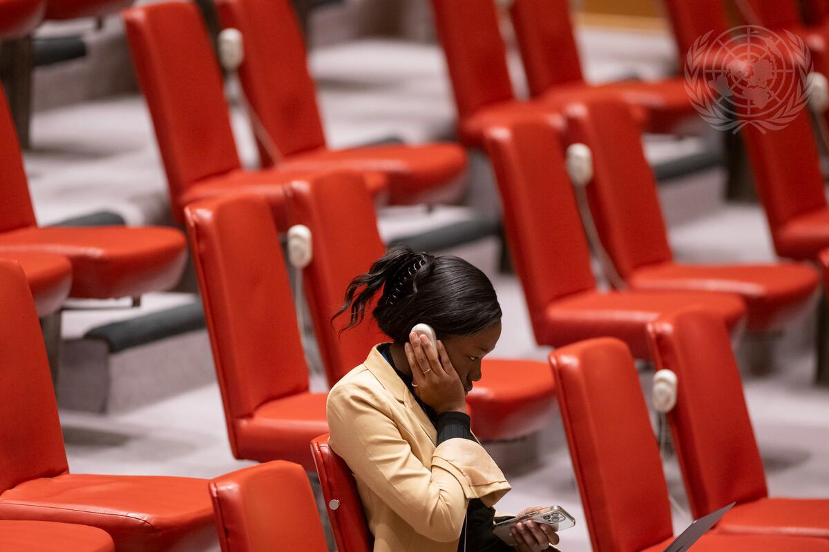 A delegate listens to the translation track during the Security Council meeting on the situation concerning Iraq.