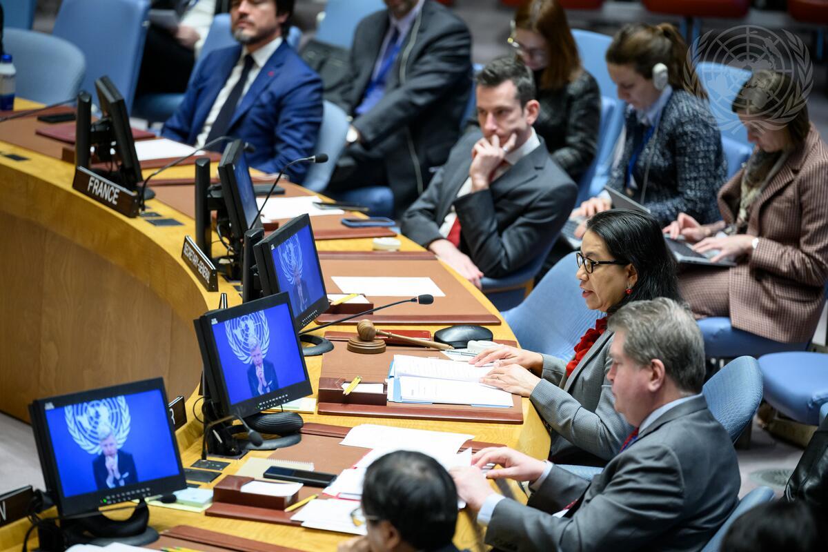 Carolyn Rodrigues-Birkett (third from bottom at table), Permanent Representative of Guyana to the United Nations and President of the Security Council for the month of February, chairs the Security Council meeting on the situation in the Middle East.