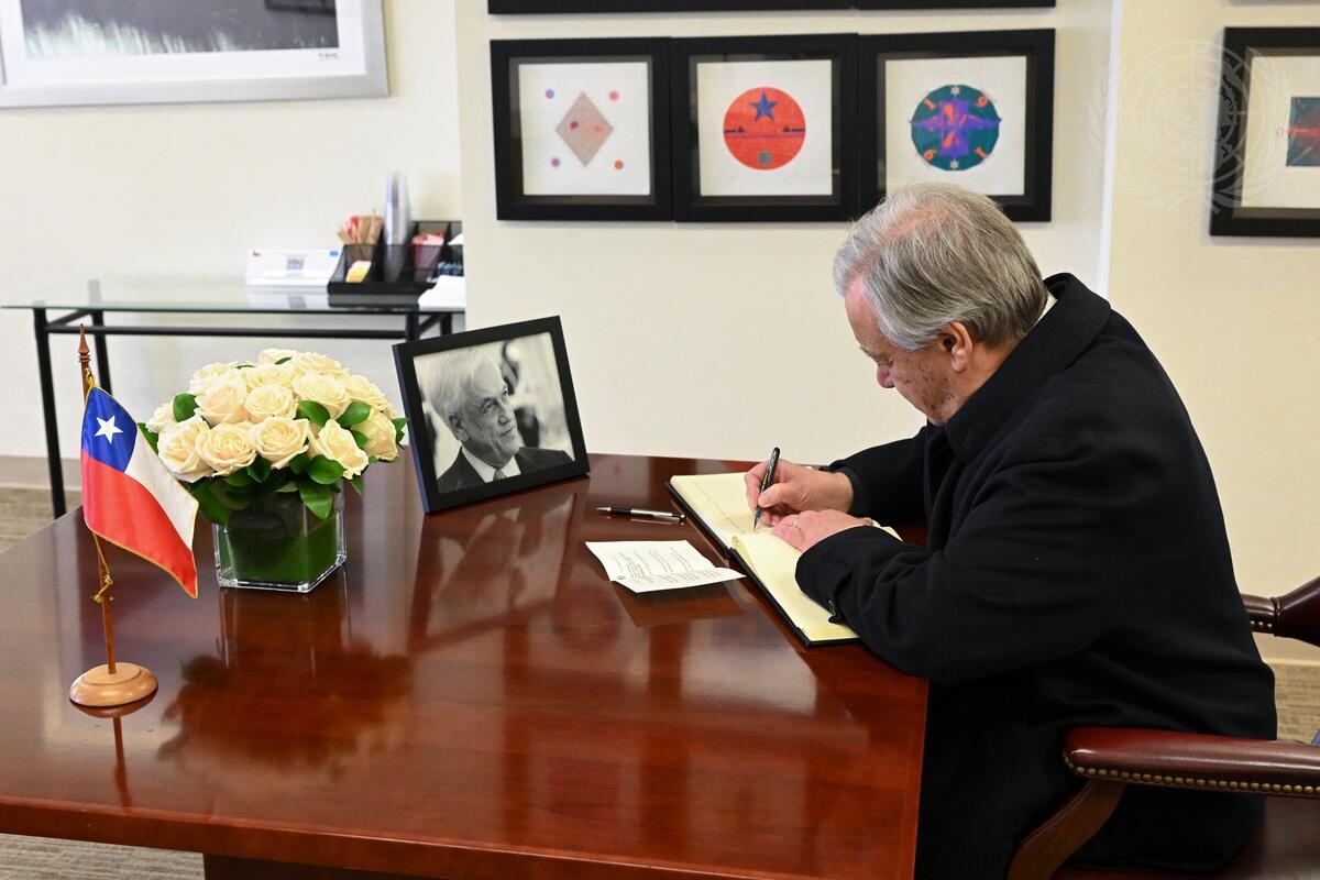 Secretary-General António Guterres signs the Book of Condolences on the occasion of the passing of Sebastián Piñera, former President of the Republic of Chile.
