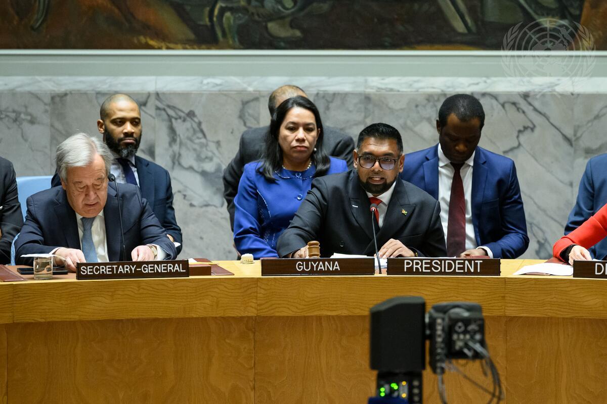 Mohamed Irfaan Ali, President of the Co-operative Republic of Guyana, speaks at the Security Council meeting on climate change and food insecurity. At left is UN Secretary-General António Guterres.