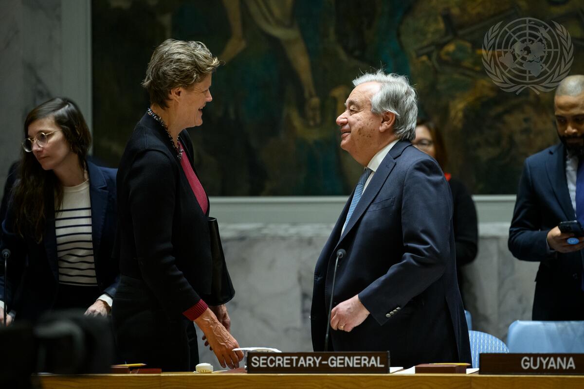 UN Secretary-General António Guterres (right) speaks with Barbara Woodward, Permanent Representative of the United Kingdom to the United Nations prior to the Security Council meeting on climate change and food insecurity.