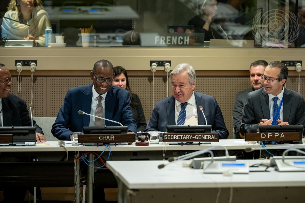 Secretary-General António Guterres (centre) shares a laugh with Cheikh Niang (left), Chair of the Committee on the Exercise of the Inalienable Rights of the Palestinian People and Permanent Representative of Senegal to the United Nations, during the meeting of the Committee on the Exercise of the Inalienable Rights of the Palestinian People.