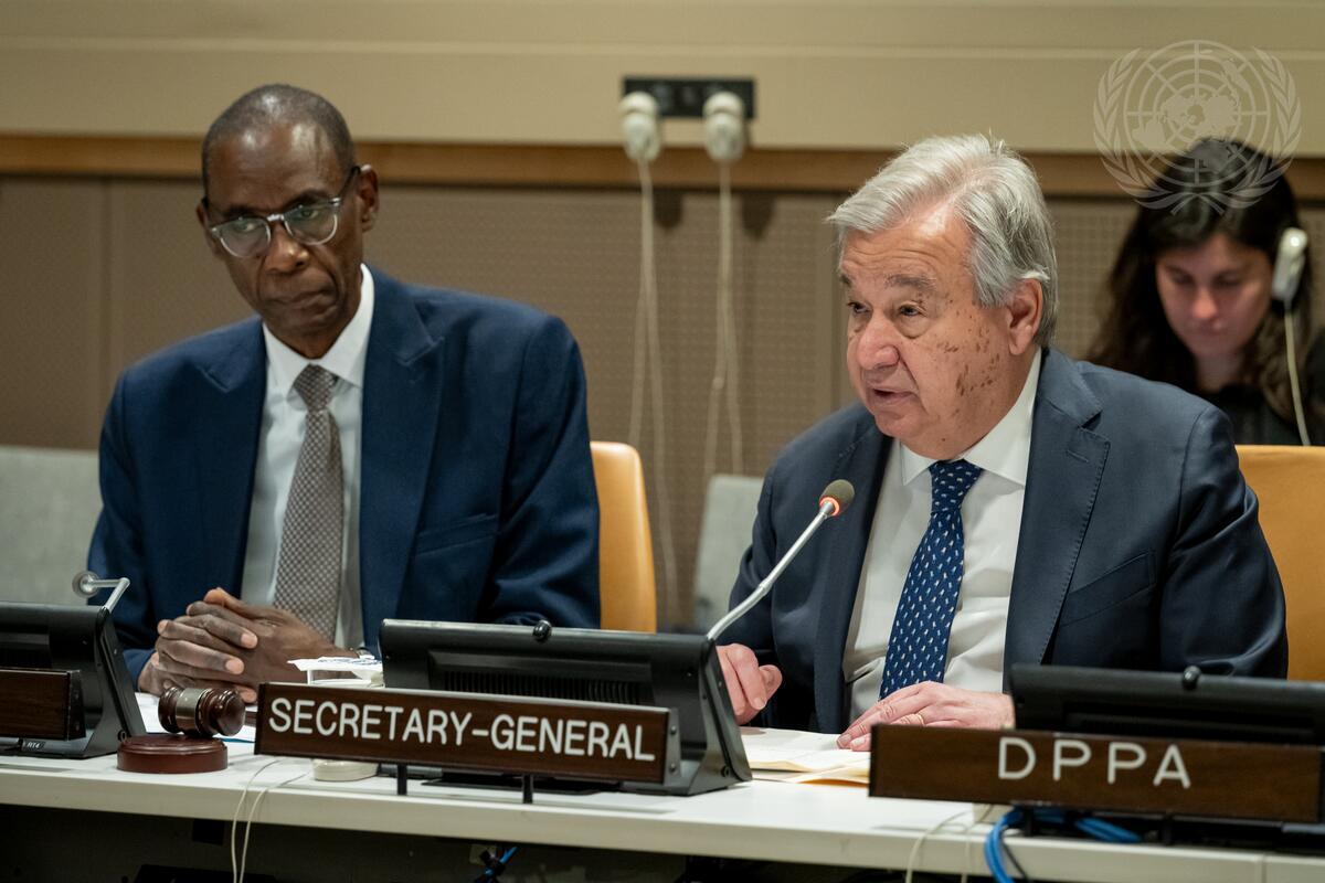 Secretary-General António Guterres (right) addresses the meeting of the Committee on the Exercise of the Inalienable Rights of the Palestinian People. At left is Cheikh Niang, Chair of the Committee on the Exercise of the Inalienable Rights of the Palestinian People and Permanent Representative of Senegal to the United Nations.
