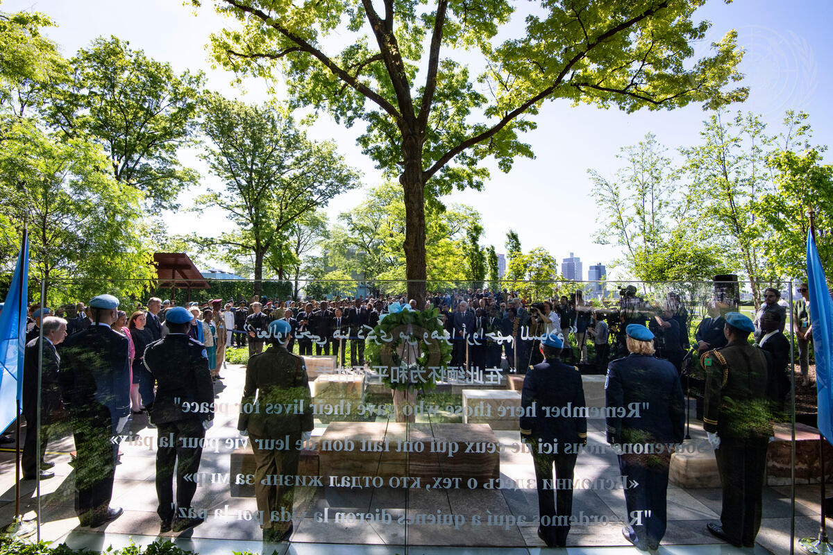 A view of the wreath-laying ceremony honouring fallen peacekeepers, in observance of the International Day of United Nations Peacekeepers (29 May). At left is Secretary-General António Guterres.