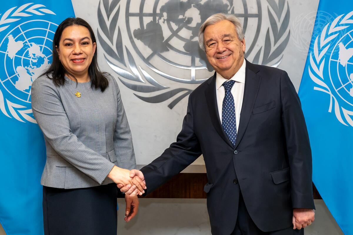 Secretary-General António Guterres (right) meets with Carolyn Rodrigues-Birkett, Permanent Representative of the Co-operative Republic of Guyana to the United Nations and President of the Security Council for the month of February.