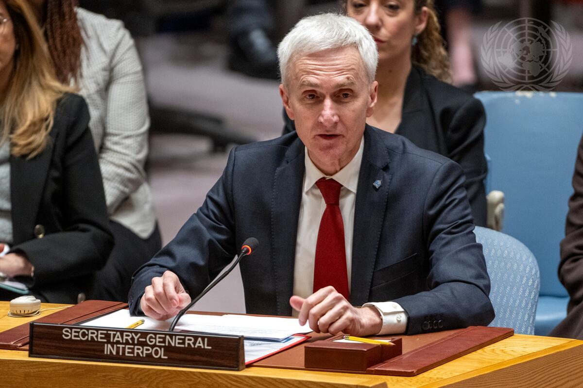 Jürgen Stock, Secretary-General of Interpol, speaks at the Security Council meeting on threats to international peace and security.