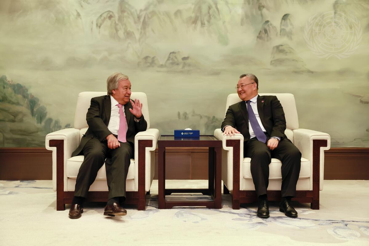 Secretary-General António Guterres (left) meets with Fu Cong, Permanent Representative of the People’s Republic of China to the United Nations, in Shanghai.