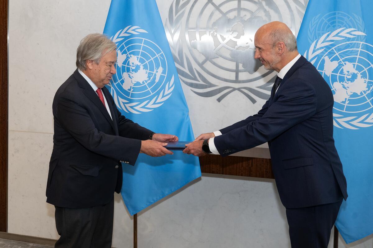 Peter Hulényi (right), Permanent Representative of Slovak Republic to the United Nations, presents his credentials to Secretary-General António Guterres.