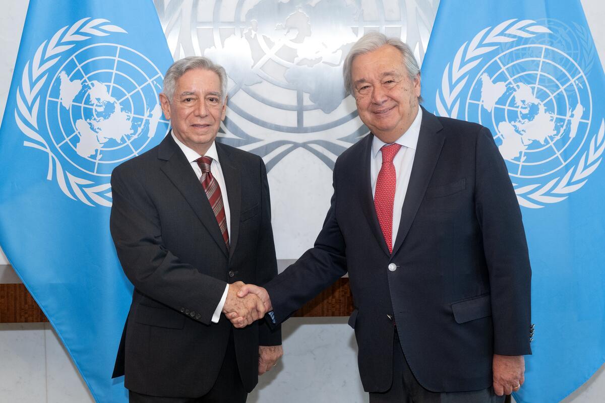 Eloy Alfaro De Alba (left), Permanent Representative of Republic of Panama to the United Nations, presents his credentials to Secretary-General António Guterres.