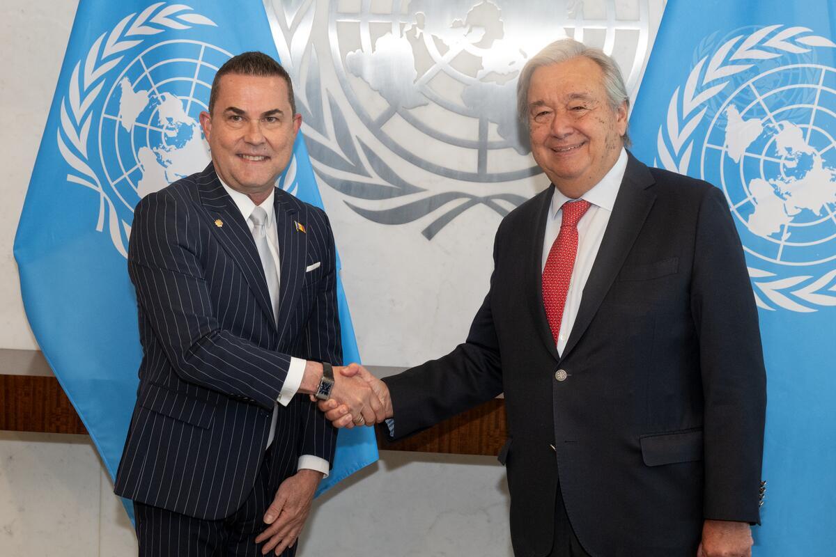 Joan Forner Rovira (left), Permanent Representative of the Principality of Andorra to the United Nations, presents his credentials to Secretary-General António Guterres.