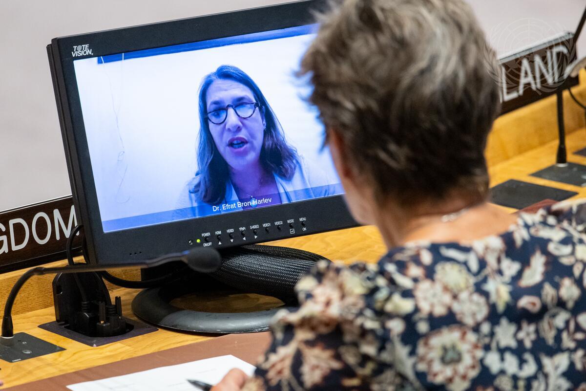 Efrat Bron-Harlev (on screen), Director of Schneider Children’s Medical Center, briefs the Security Council meeting on the situation in the Middle East, including the Palestinian question.