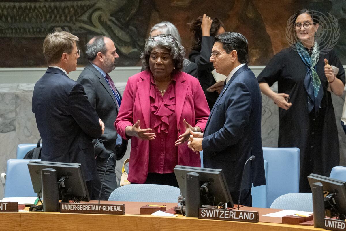 Linda Thomas-Greenfield (third from left), Permanent Representative of the United States to the United Nations, speaks with Samuel Žbogar (left), Representative to the Security Council of the Republic of Slovenia to the United Nations Security Council and President of the Security Council for the month of September, and Danny Danon (second from right), Permanent Representative of Israel to the United Nations, ahead of the Security Council meeting on the situation in the Middle East, including the Palestinian question.