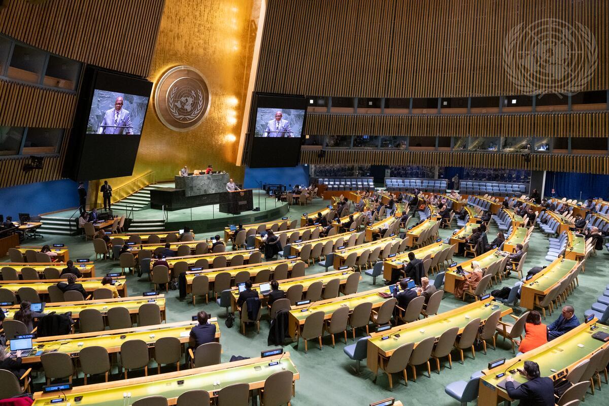 A wide view as Dennis Francis (at podium and on screens), President of the seventy-eighth session of the General Assembly, addresses the 64th plenary meeting of General Assembly held in commemoration of the abolition of slavery and the transatlantic slave trade to mark the International Day of Remembrance of the Victims of Slavery and the Transatlantic Slave Trade.