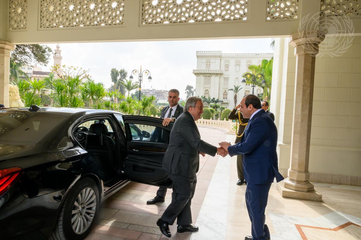 Secretary-General António Guterres (centre) is greeted by Abdel Fattah Al Sisi, President of the Arab Republic of Egypt.